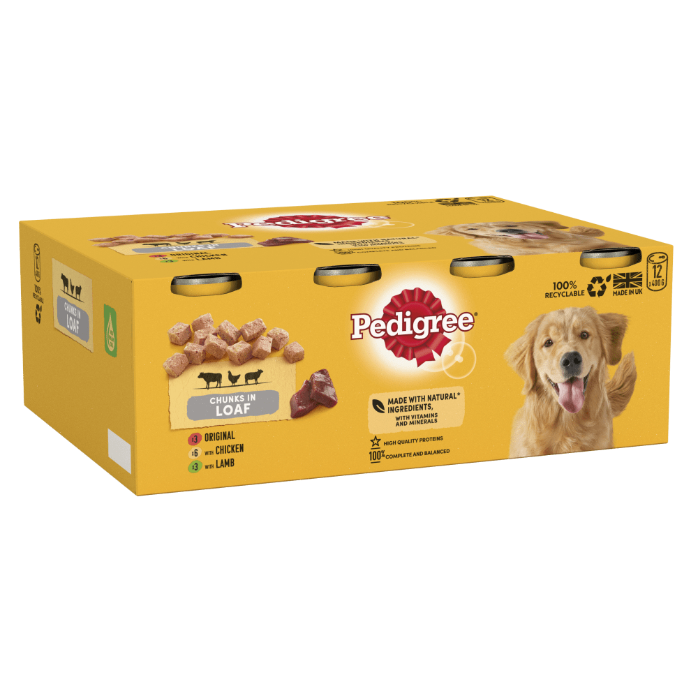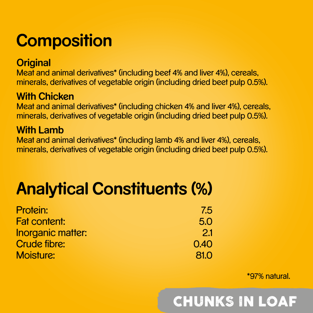 PEDIGREE® Chunks in Loaf is carefully crafted with selected natural ingredients, vitamins, and minerals to provide 100% complete and balanced nutrition, fueling your dog's exuberant love of life. Available in 6x & 12x cans, our Chunks in Loaf range includes Original, Chicken, and Lamb flavors, offering variety for your dog's enjoyment.