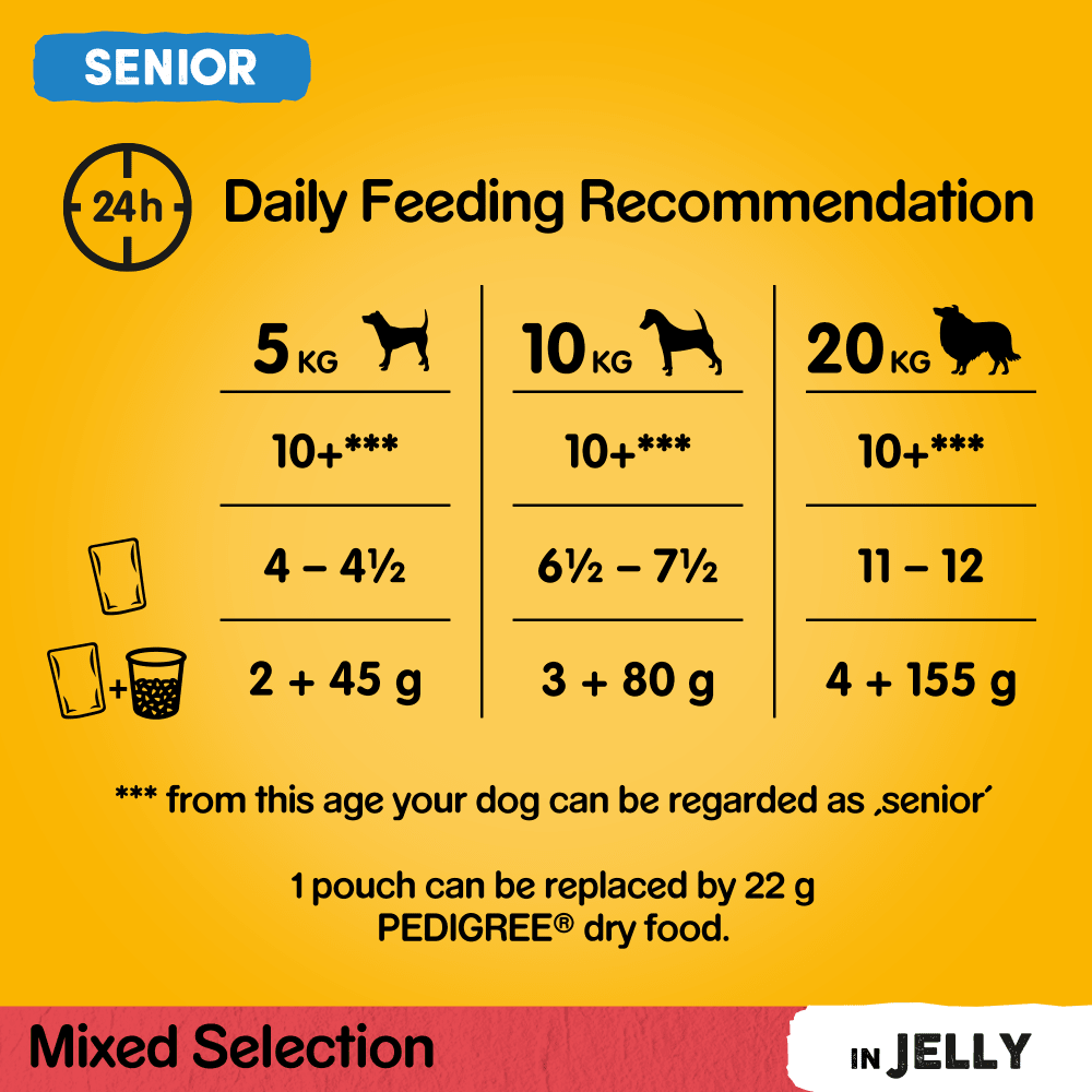 With PEDIGREE® Senior Mixed Selection in Jelly, you can be confident that you are providing your senior dog with the best nutrition to support their health and vitality. Fuel their love of life with this complete and balanced wet dog food, making each mealtime a joyful and satisfying experience during their golden years. Prioritize their health and happiness with PEDIGREE® Senior Mixed Selection in Jelly, keeping their tail wagging and their spirit alive!