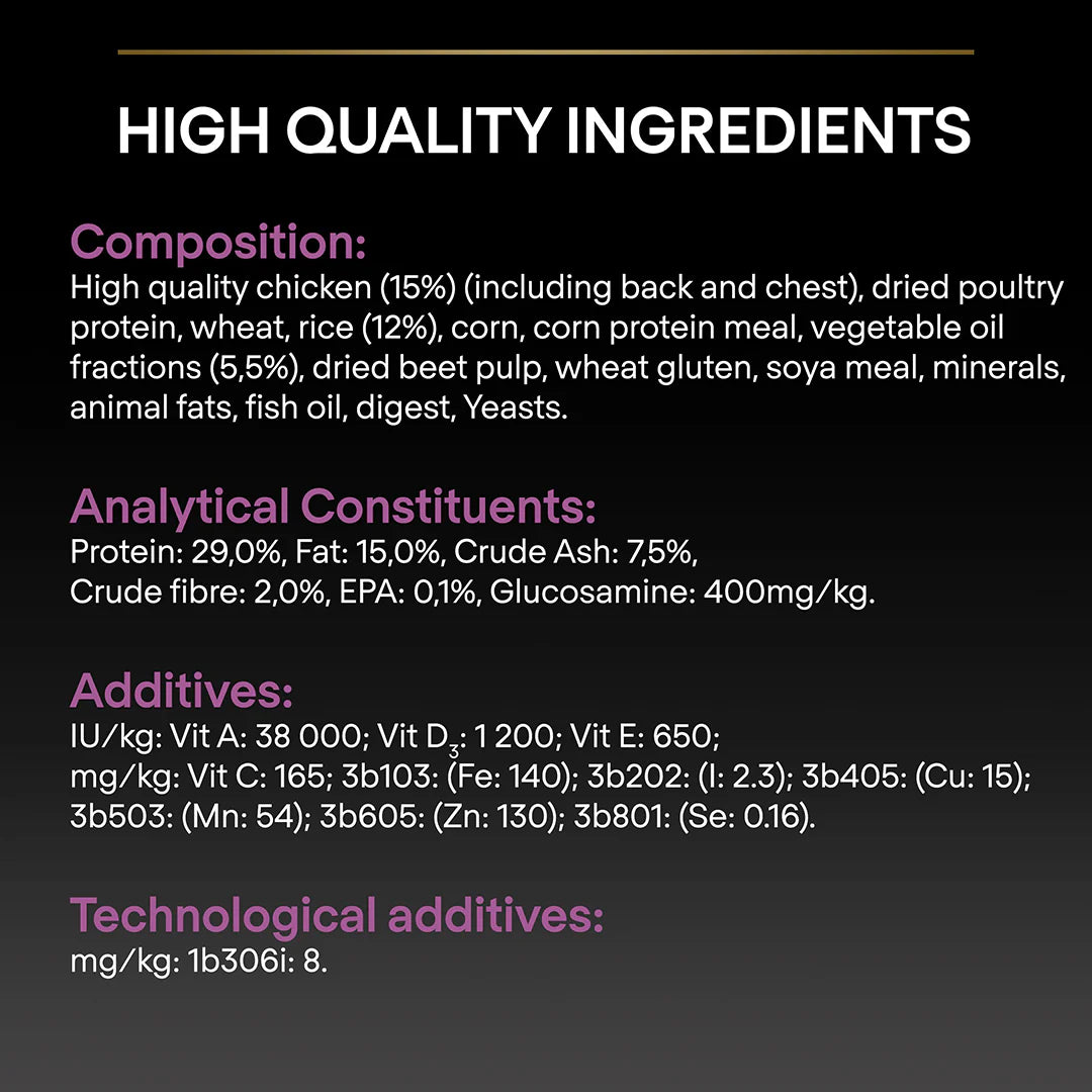 Purina PRO PLAN Age Defence dry dog food is crafted with high-quality chicken pieces as the primary ingredient. It is formulated with adapted protein and fat levels to help your dog maintain their best shape during their golden years. Each Age Defence formula contains specific levels of botanical oils that have been proven to support cognitive function in the brain, promoting alertness, mental sharpness, and interaction with the family in dogs aged 9 years and older. Additionally, glucosamine and EPA, an omega-3 fatty acid, help support your dog's joint mobility for healthy ageing.