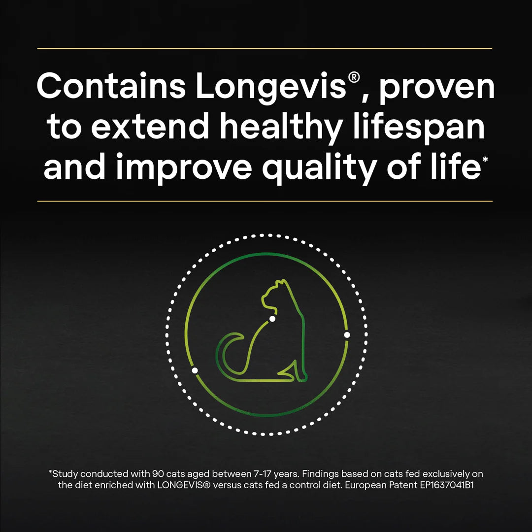 Introducing PRO PLAN Sterilised Senior Adult 7+, a scientifically formulated complete wet cat food designed to support healthy ageing in cats over 7 years old. This specialized formula contains LONGEVIS, a patented nutrient blend consisting of antioxidants, prebiotics, and omega-3 and omega-6 fatty acids. These ingredients have been proven to enhance the lifespan and improve the quality of life in cats aged 7 and above. Each pouch of this premium food provides all the essential nutrients necessary for your cat's overall well-being, along with the delectable taste of tender protein-rich turkey chunks.