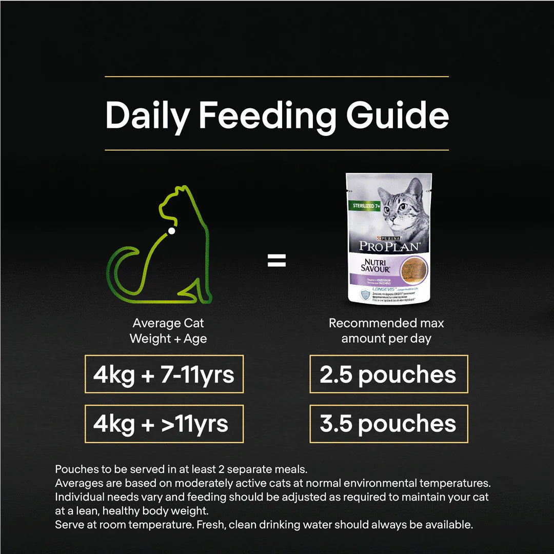 For an average cat of 4 kg and 7-11 years old, feed up to 2.5 pouches per day and for a cat >11 years old, feed up to 3.5 pouches per day in at least 2 separate meals. The senior maintenance averages are based on moderately active cats at normal environmental temperatures. Individual needs vary and feeding should be adjusted as required to maintain your cat at a lean, healthy body weight.