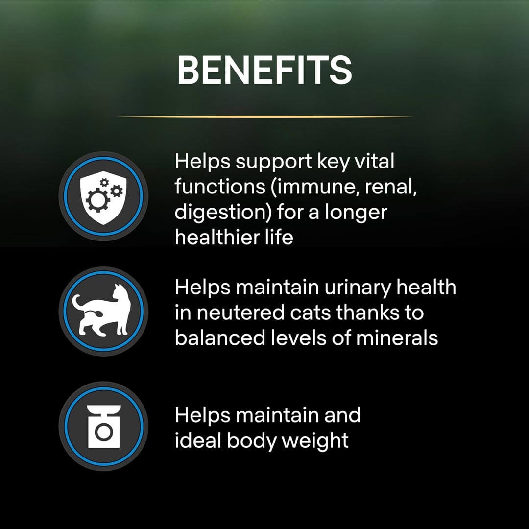 Specifically designed for sterilized adult cats aged 7 and above, PRO PLAN LIVECLEAR Sterilised Adult 7+ offers exceptional and complete nutrition that supports the long-term health of your mature cat. It aids in maintaining their vital functions, including the immune system, renal health, and digestion, promoting a longer and healthier life.