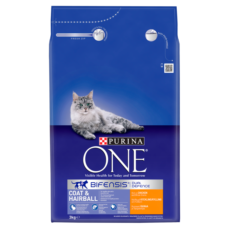PURINA ONE Coat and Hairball is specifically designed to effectively maintain a healthy skin and beautiful coat for your cat. The skin and coat are the first line of protection for your cat's body and are therefore important to keep her in a healthy condition. PURINA ONE Coat and Hairball is specifically designed to maintain a healthy skin and beautiful coat for your cat by providing appropriate levels of key nutrients, including high-quality protein, vitamins and essential fatty acids. It also helps minimise the formation of hairballs thanks to its high fibre content and a special combination of fibres including cellulose.