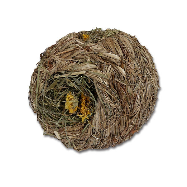 Crafted from 100% natural woven grass, this large ball measures 15cm in diameter and is filled with a delightful combination of meadow hay, dandelion, and marigold. It offers a real boredom-breaking challenge for rabbits, guinea pigs, and chinchillas, encouraging natural foraging behaviours and physical activity. Additionally, smaller pets like degus, rats, and hamsters will find it an ideal space for play and nesting.