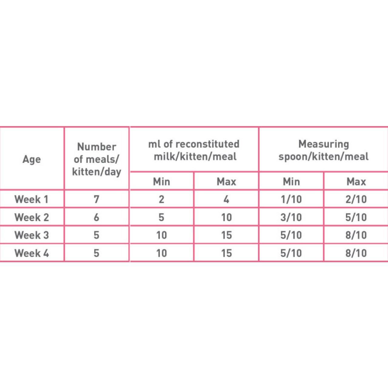 Kitten's age | Nº of meal/kitten/day | ml of reconstituted milk/ kitten/meal | - |
