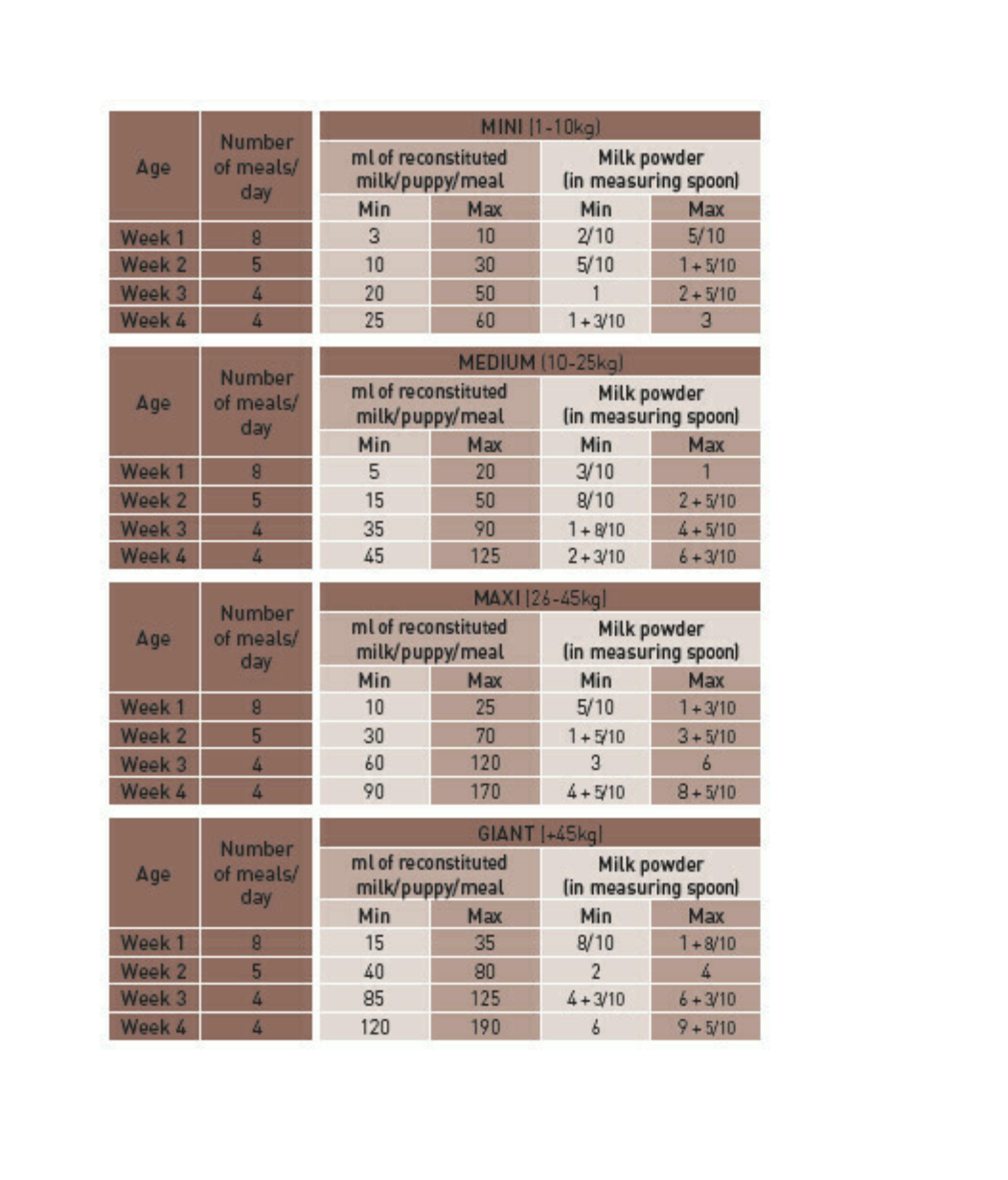 Age Week | Mini (1-10 kg) | Medium (11- 25 kg) | Maxi (26-44kg) | Giant (+ 45 kg) | |