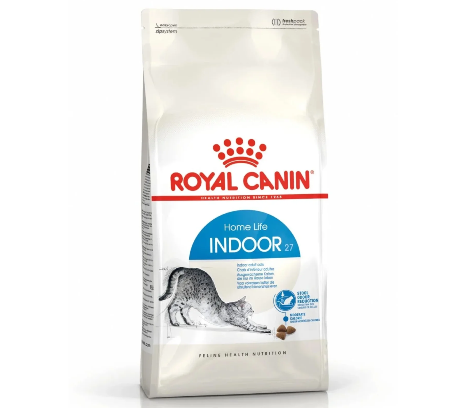 Since indoor cats have lower activity levels than outdoor cats, ROYAL CANIN® Indoor 27 food has a moderate fat content to ensure that your cat's calorie intake is aligned with its level of activity, which contributes to maintaining a healthy weight. Indoor cats tend to groom themselves for long periods, and this food includes specific dietary fibres, such as psyllium, which help to stimulate the clearance of ingested hair and reduce hairballs.