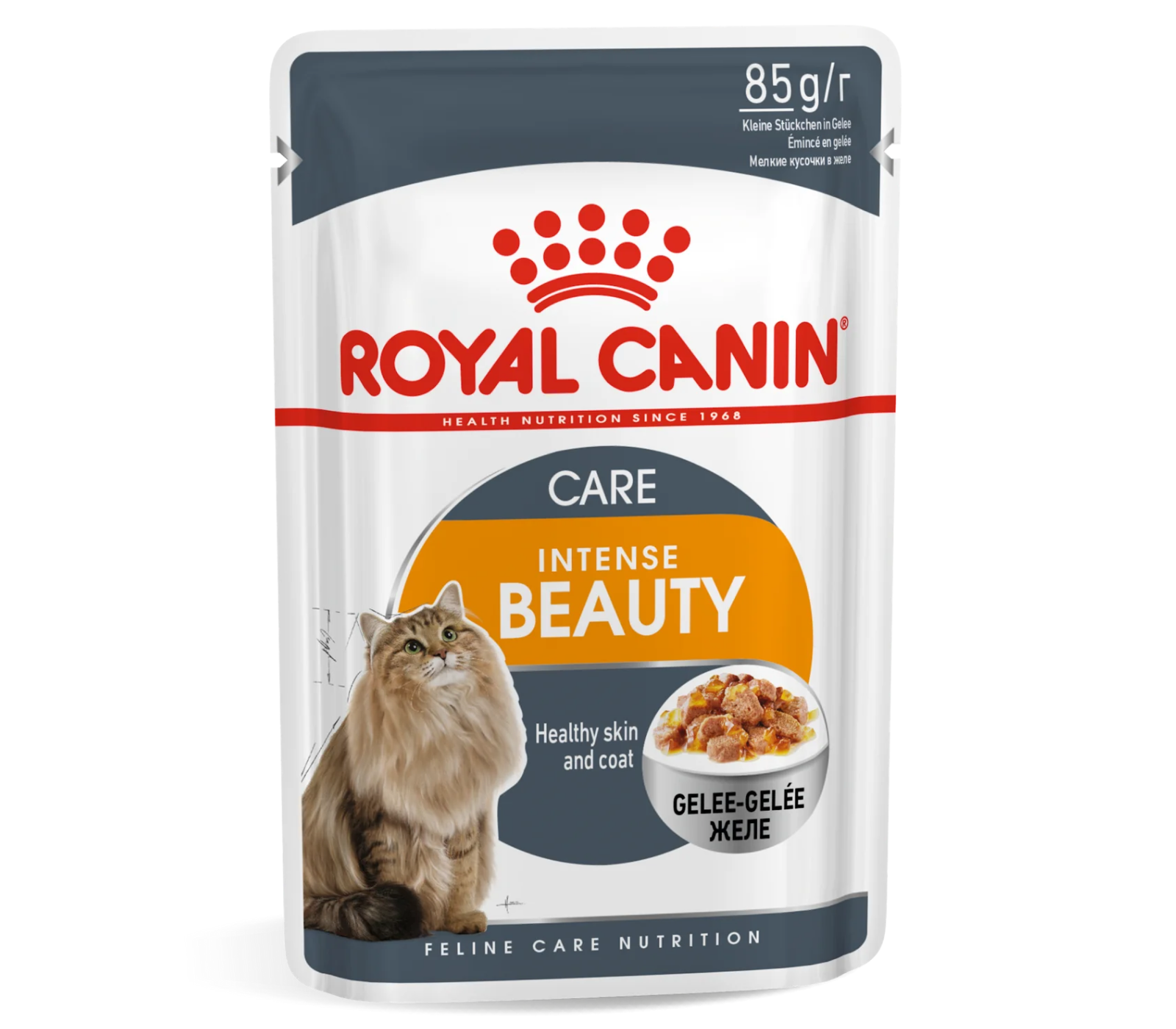 Hair and skincare are vital to your cat's well-being, as it serves as an external indicator of their overall health and comfort. With ROYAL CANIN® Intense Beauty in Jelly, you can ensure that your cat's skin health, coat health, and general well-being are never compromised.