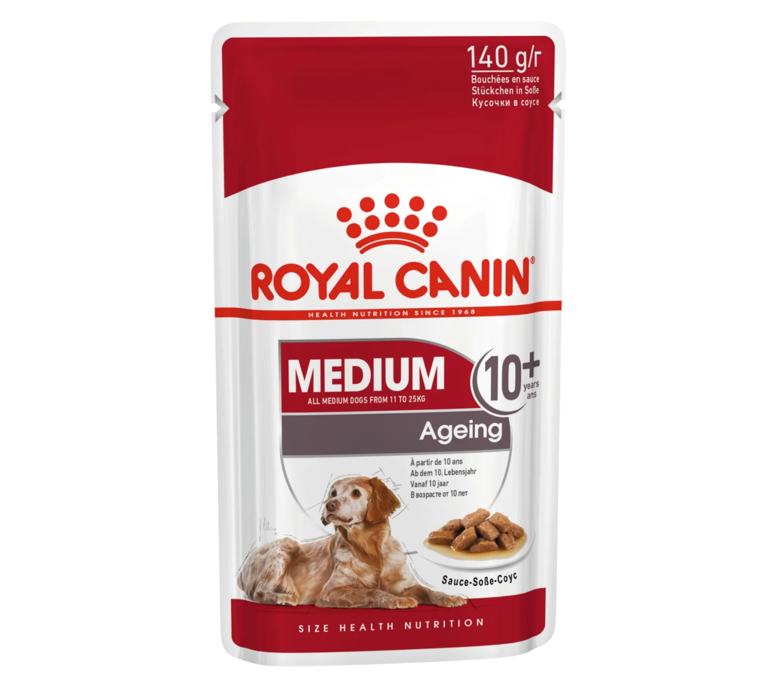 Tailored for medium-sized dogs aged 10 years and older, weighing between 11-25kg, ROYAL CANIN® Medium Ageing 10+ in Gravy is meticulously formulated to meet the specific nutritional needs of dogs in this life stage.