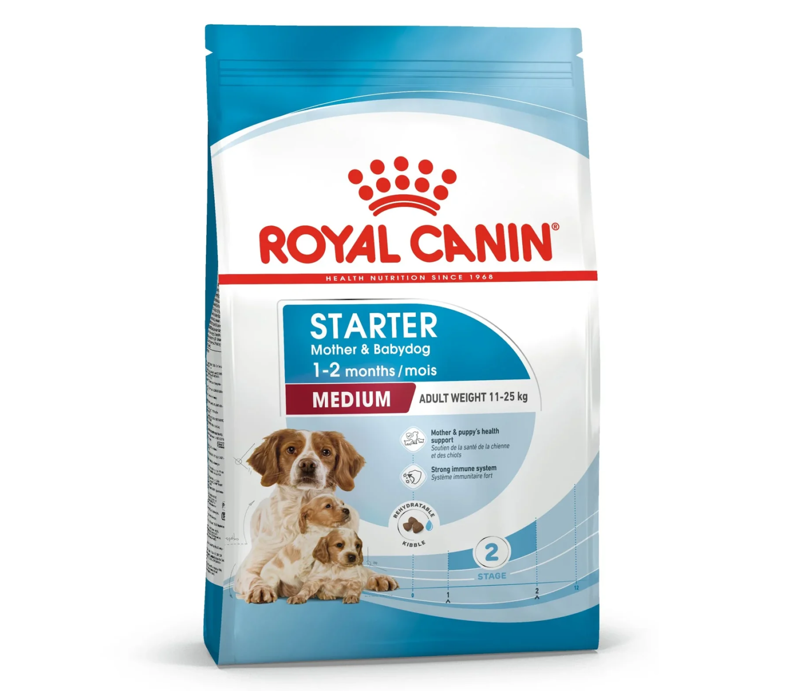 ROYAL CANIN® Medium Starter Mother & Babydog is enriched with nutrients, including vitamins C and E, to help support natural defences. It contains a combination of beneficial prebiotics (such as MOS) and highly digestible proteins to support a healthy balance of intestinal microbiota (gut flora) for good digestion. Moreover, this formula contains omega-3 fatty acids (such as DHA) to help support healthy brain development in young puppies.