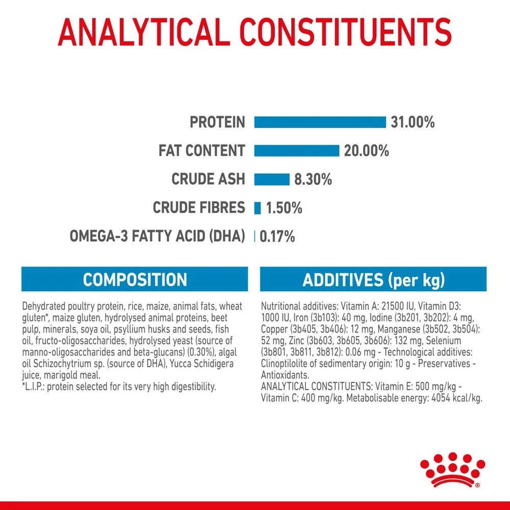 This tailored diet is enriched with omega-3 fatty acids, such as DHA, which support healthy brain development in puppies. It also contains beneficial prebiotics, such as FOS, MOS, and beet pulp, and highly digestible proteins that help maintain a healthy balance of intestinal microbiota for optimal digestion. Additionally, ROYAL CANIN® X-Small Puppy includes vitamins C and E to support the puppies' natural defences during the critical growth period when their immune system is developing. The formula also contains optimal energy content to meet the high-energy needs of fast-growing, extra-small breed puppies.