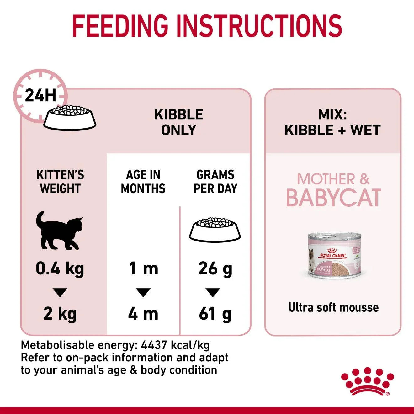 The kibble in ROYAL CANIN® Mother & Babycat is easy to rehydrate with water, giving it an appetising porridge texture that's ideal for weaning kittens and supporting their hydration. As kittens grow, their nutritional needs change. In just 16 weeks, they require a diet that's specially adapted to meet their nutritional needs during the next growth phase. You can transition them onto ROYAL CANIN® diets for kittens, available as dry kibble or wet chunks in loaf, gravy, or jelly.