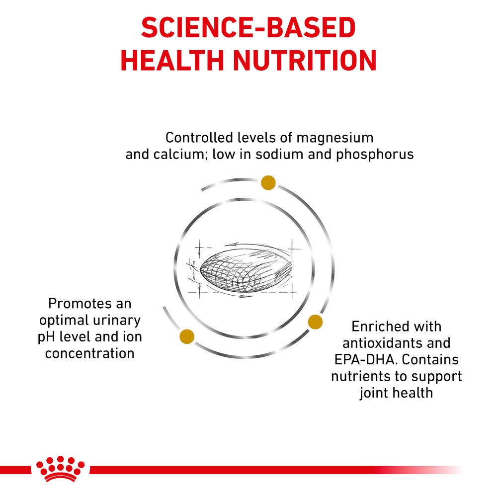 ROYAL CANIN® URINARY S/O AGEING 7+ dry is a comprehensive dietetic feed formulated for dogs. It is designed to assist in the dissolution of struvite stones and the reduction of struvite stone recurrence.