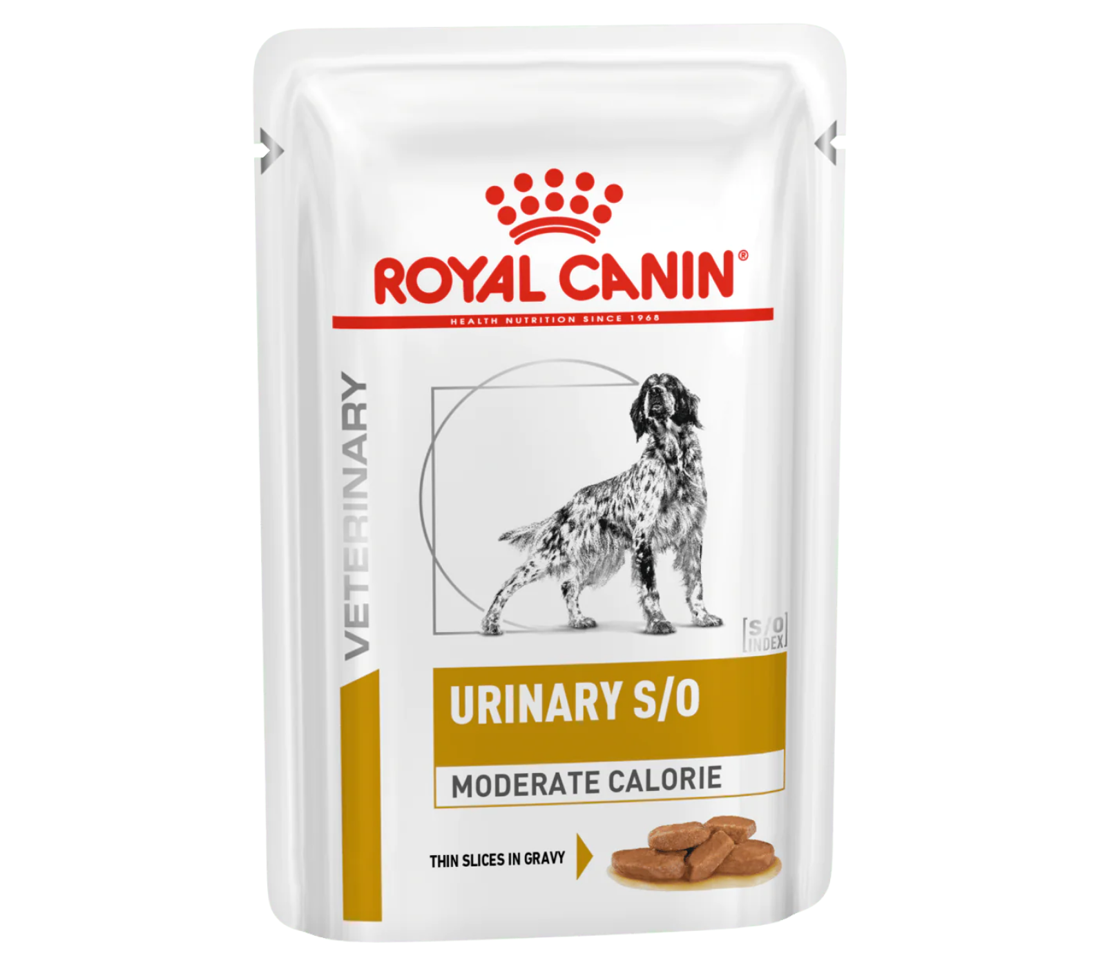 ROYAL CANIN® URINARY S/O MODERATE CALORIE thin slices in gravy is a complete dietetic feed specially formulated for dogs. It is designed for the dissolution of struvite stones and the reduction of struvite stone recurrence.