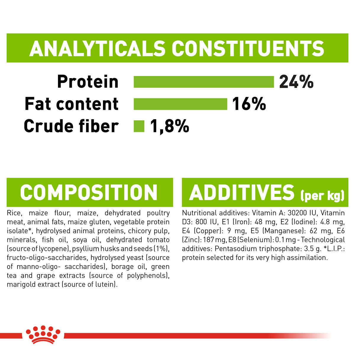 ROYAL CANIN® X-Small Adult is enriched with very high-quality protein (L.I.P), carefully selected for its ease of digestibility. This protein, in combination with a balanced intake of fibres like psyllium, promotes healthy intestinal transit and ensures good stool quality. Additionally, this formula supports a healthy urinary system, which is especially important for very small breed dogs.