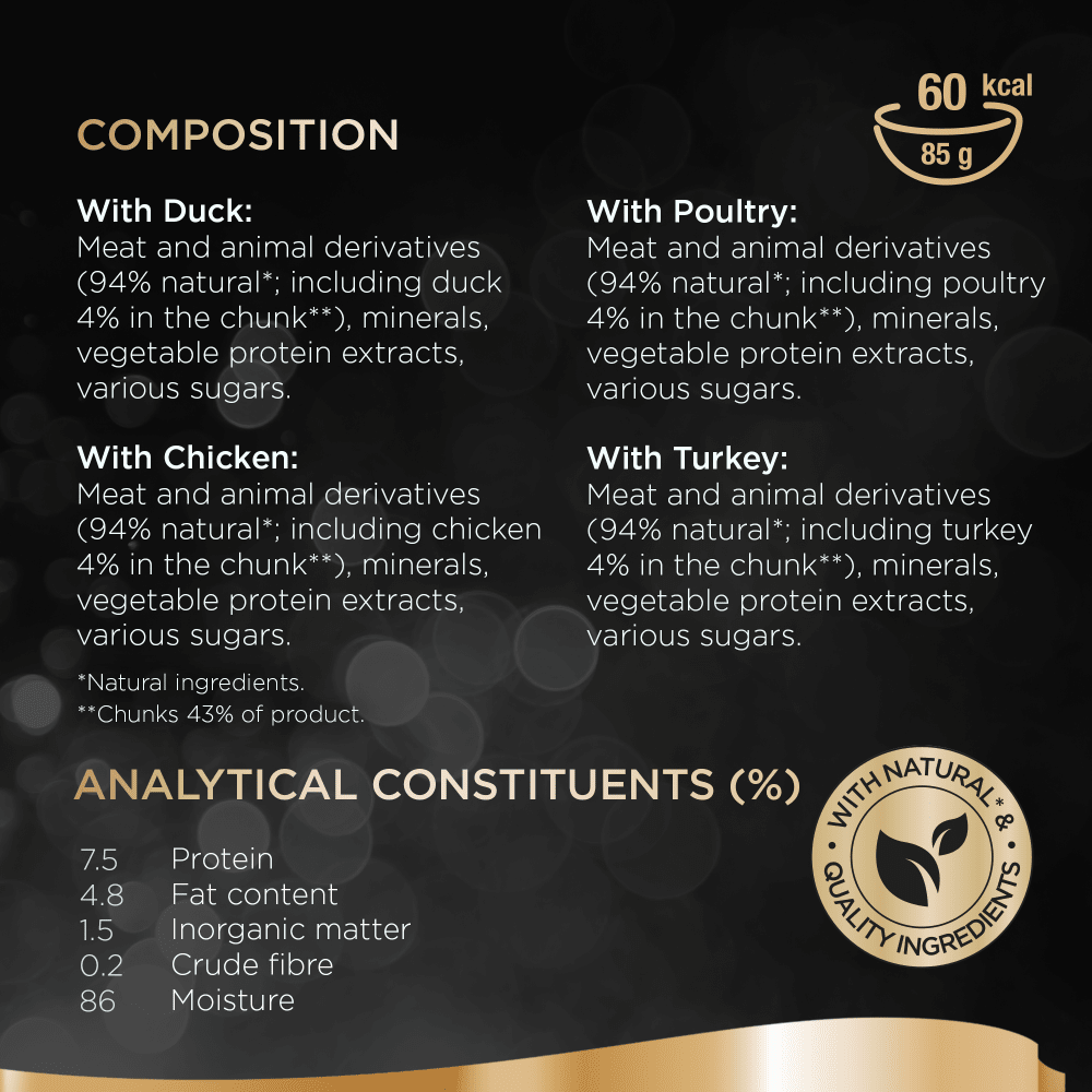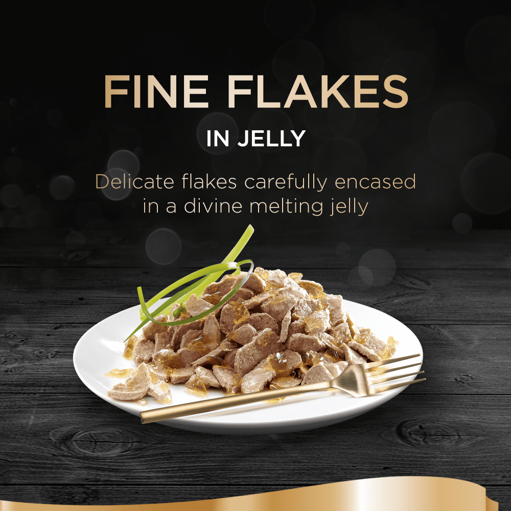 Indulge your feline's palate with our scrumptious flake pieces, carefully prepared in a divine melting, smooth jelly. This high-quality adult cat food offers complete and balanced nutrition, made from carefully selected ingredients without any artificial colours or preservatives.