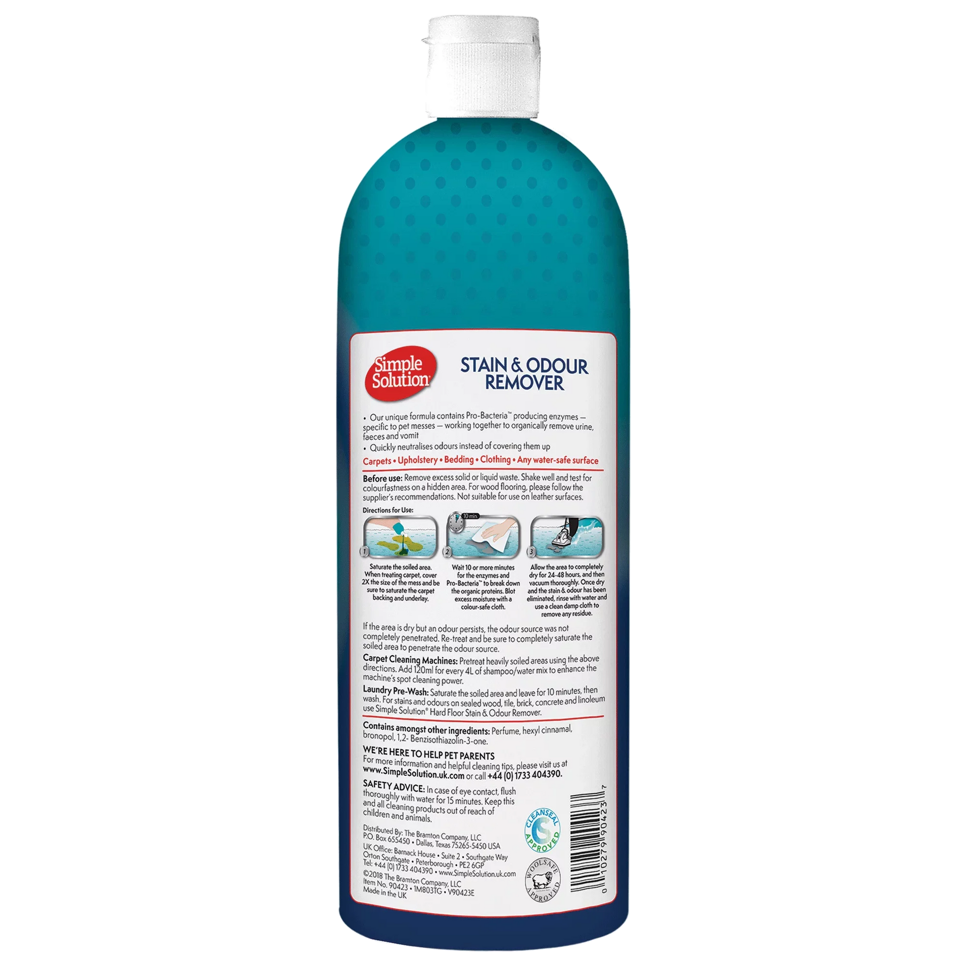 Say goodbye to frustration caused by tough and smelly pet stains with Simple Solution Stain & Odor Remover. This powerful solution is specially formulated with Pro-Bacteria™ and enzymes that work in harmony to break down, neutralize, and permanently eliminate stains and odour. Moreover, it discourages dogs and cats from making repeat "visits" to the same spots.