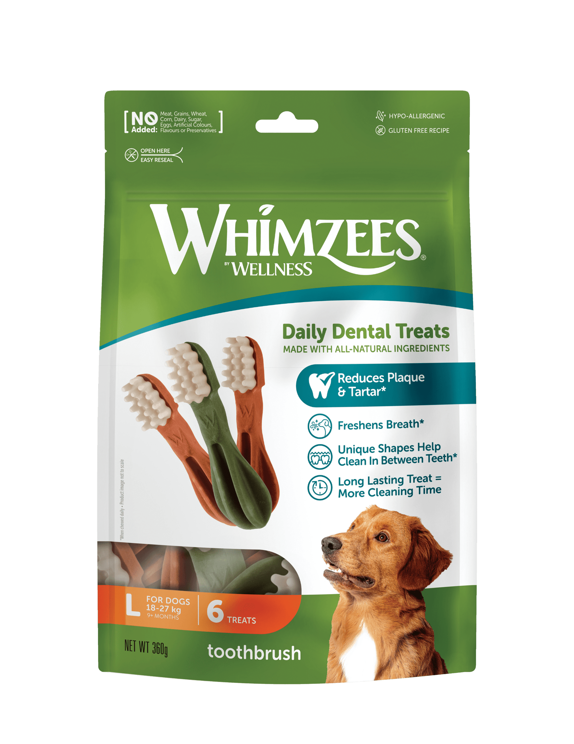 Instil a new love for "brushing" with the entertaining shape of WHIMZEES Toothbrush Daily Dental Dog Chews, specially designed for large dogs weighing 18-27kg.