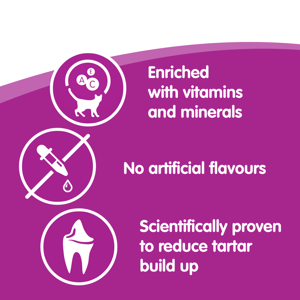 In addition to their oral health benefits, WHISKAS® DENTABITES are enriched with essential vitamins and minerals to support your cat's overall well-being. A healthy diet is vital for a cat's vitality, and these bites offer an additional nutritional boost to their regular meals.