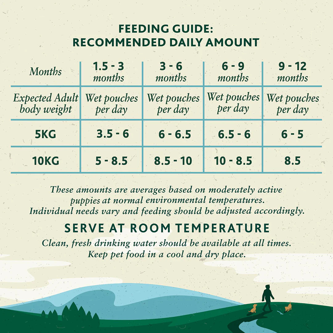 Age (months) | Wet Pouch Pouches Dry Food (g)* | Wet Pouch Pouches Dry Food(g)* | Wet Pouch Pouches Dry Food (g)* |