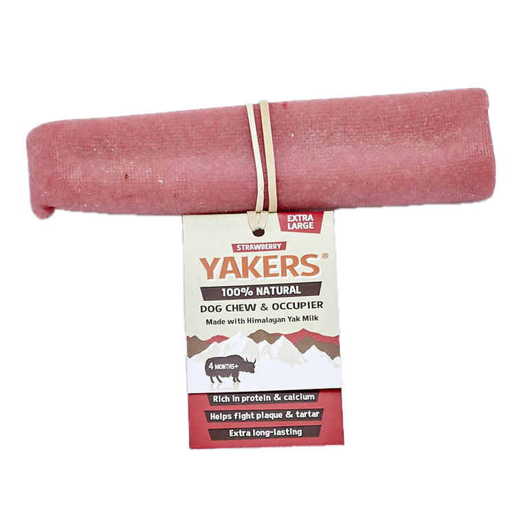 Yakers Strawberry Dog Chew Extra Large is a natural and durable chew treat for dogs, typically made from a blend of yak milk, cow milk, lime, and strawberries. These chews are hardened through a traditional Himalayan recipe, creating a long-lasting chew that dogs enjoy gnawing on. The addition of strawberries adds a hint of fruity flavor to entice dogs during chewing.