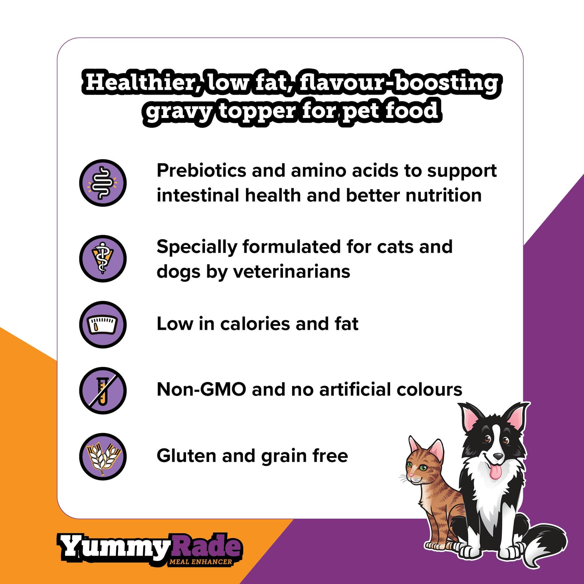 Treat your beloved companions to the best of flavours and health support with YummyRade. Experience the difference that a delightful meal-enhancer can make in your pet's life. Try YummyRade today and see your pets relish their meals like never before!